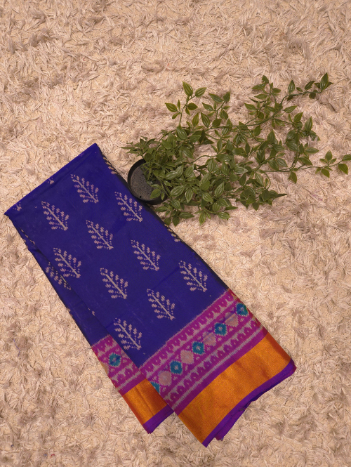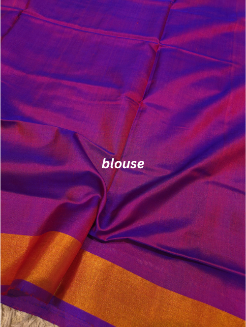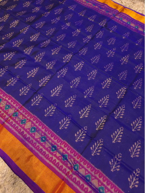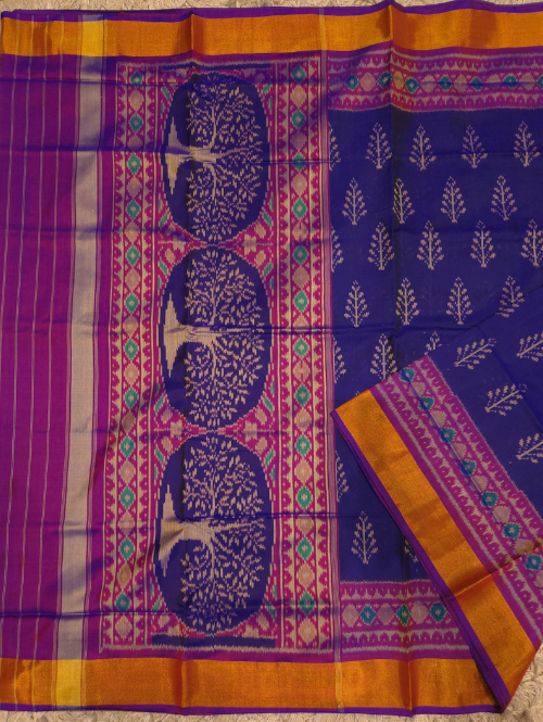 get yourself this beautiful blue magenta patola saree, made from pure mulberry silk. comes with a beautiful plain blouse.