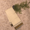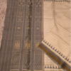 This off-white Rajkot Patola saree features an elegant Dalyabhat design with small dot patterns woven across the body. A delicate temple border with a subtle zari border enhances its traditional charm. The grey pallu showcases an artistic blend of block-inspired designs, adding a unique touch. Paired with a plain blouse, this saree is a perfect blend of heritage and elegance. A timeless choice for those who appreciate intricate handwoven craftsmanship.