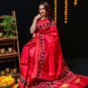 Discover our Red Single Ikat Patola Saree, featuring a rich plain (Gaala) body and a traditional border pallu. This saree effortlessly blends elegance with tradition, making it a versatile choice for any occasion. Embrace the timeless charm of this classic piece and add it to your collection.