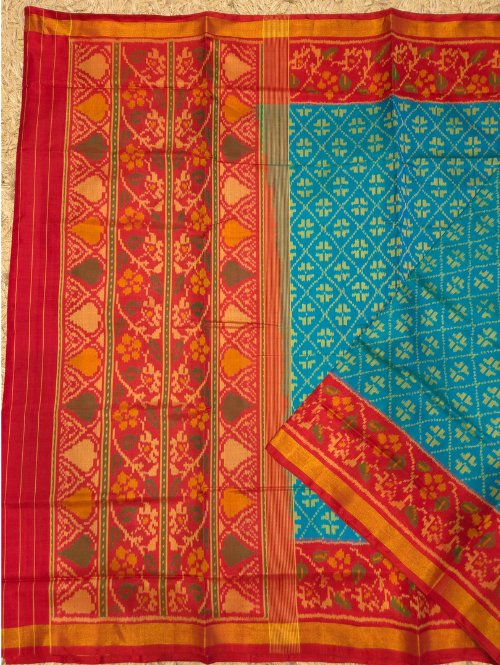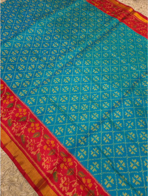get yourself this beautiful sea green to red patola saree, made from pure mulberry silk. comes with a beautiful plain blouse.