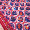 This exquisite Double Ikkat Patan Patola saree features a pristine white base adorned with multiple traditional motifs like lions, peacocks, elephants, parrots, and trees, all woven in mesmerizing blue geometrical buckets. The saree is framed with a rich rani pink border and an identical pallu on both sides, a hallmark of authentic Patan Patola craftsmanship. This heirloom masterpiece comes without a blouse piece