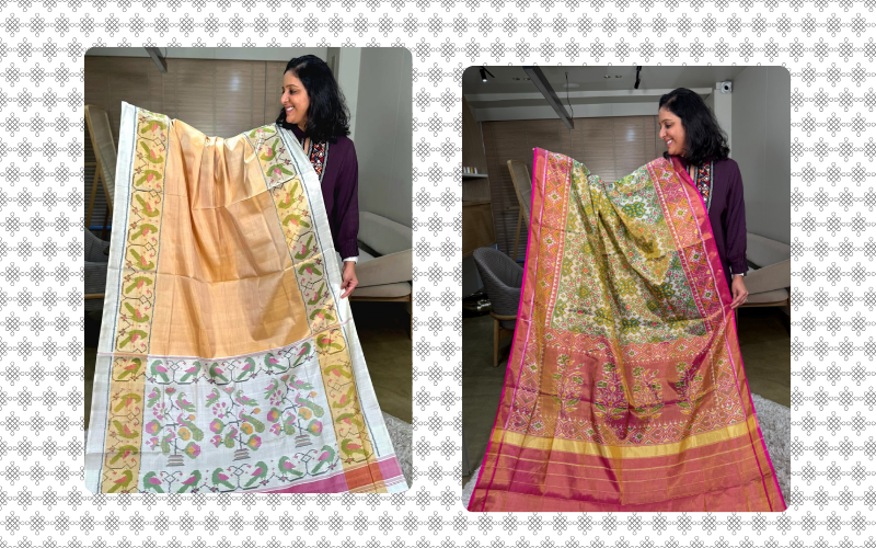 Pair your saree with embroidered juttis, embellished mojaris, or gold-toned heels for a royal finish. Single ikat Patola sarees look stunning with sleek, modern footwear, while double ikat Patola sarees match well with traditional ethnic shoes.